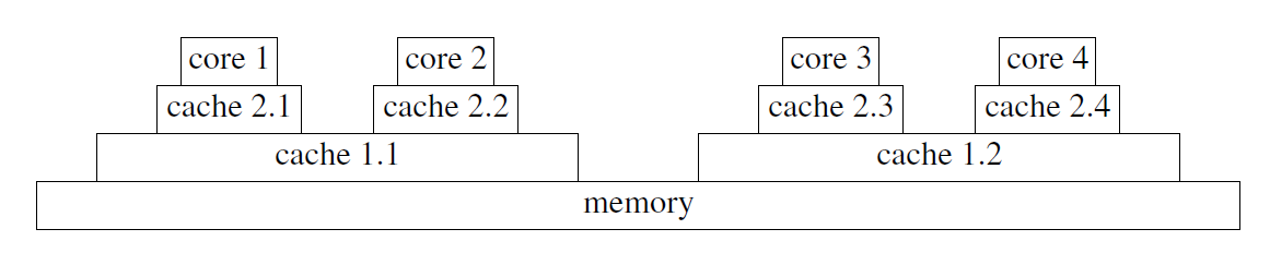 将一个字的值从内存加载到缓存,然后再加载到寄存器中,所需的时间(在处理器的时间尺度来看)可能非常长。理想情况下,可能需要执行 500 条指令才能将值加载到寄存器中,然后再执行 500 条指令才能将新值加载到其目标位置。500 这个数字只是一个估计值,它取决于机器架构,并且会随时间变化,但在过去几十年中,这个数字一直在稳步增长。当计算针对吞吐量进行了优化,因此无需急于加载和存储特定值时,所需的时间可能会更长。一个值可能在数万个指令周期内“远离其目标位置”。这正是现代硬件拥有惊人性能的原因之一,但也带来了巨大的混乱风险,因为不同的线程会在不同的时间、不同的内存层次结构位置访问同一个值。例如,我简化的描述只提到了单级缓存;许多流行的架构都使用三级缓存。为了说明这一点,下图展示了一种可能的两级缓存架构,其中每一个核心都有自己的二级缓存,一对核心共享一级缓存,所有核心共享内存: