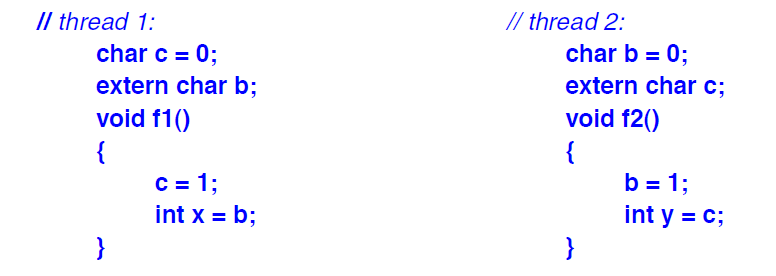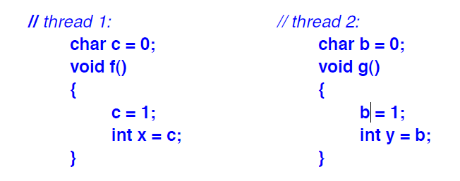 如果没有定义明确且合理的内存模型,线程 1 可能会读取包含 b 和 c 的字,修改 c,然后将该字写回内存。同时,线程 2 也可能对 b 执行相同的操作。那么,哪个线程先读取了该字,哪个线程最后将结果写回内存,将决定最终结果。我们可能会得到 10, 01 或 11( 但不会得到 00 )。内存模型避免了这种混乱;我们得到了 11。之所以不会出现 00,是因为 b 和 c 的初始化(由编译器或链接器完成)在两个线程启动之前就已经完成。