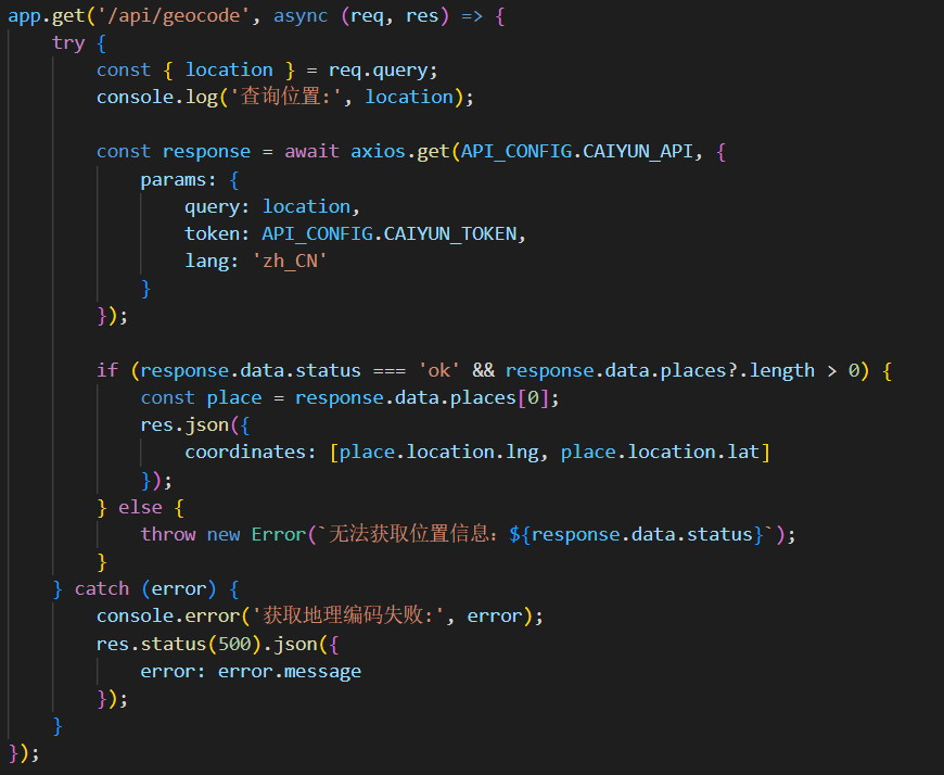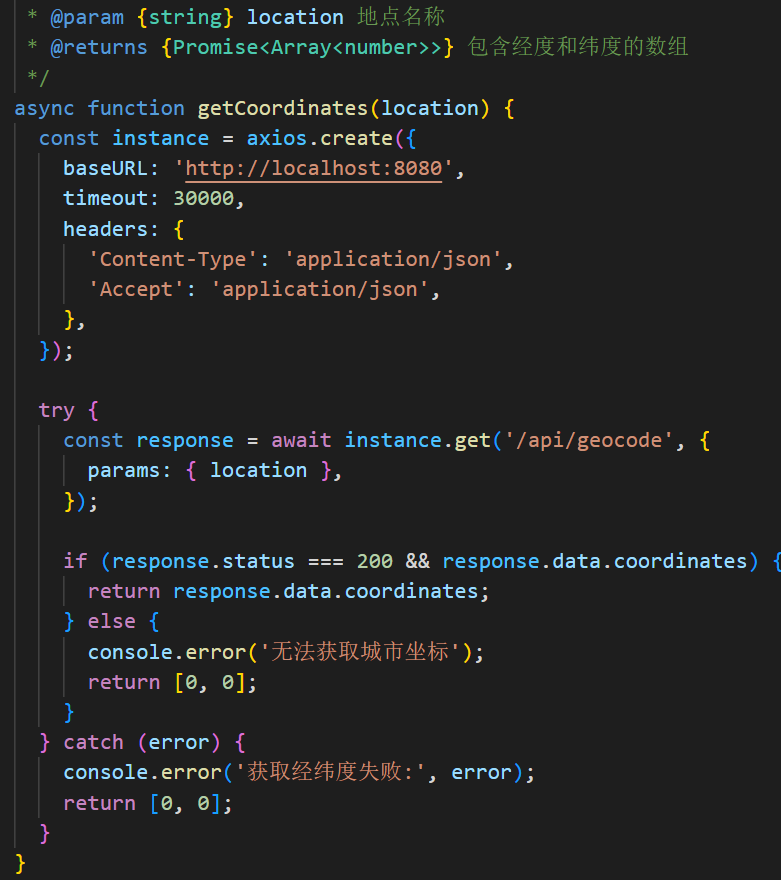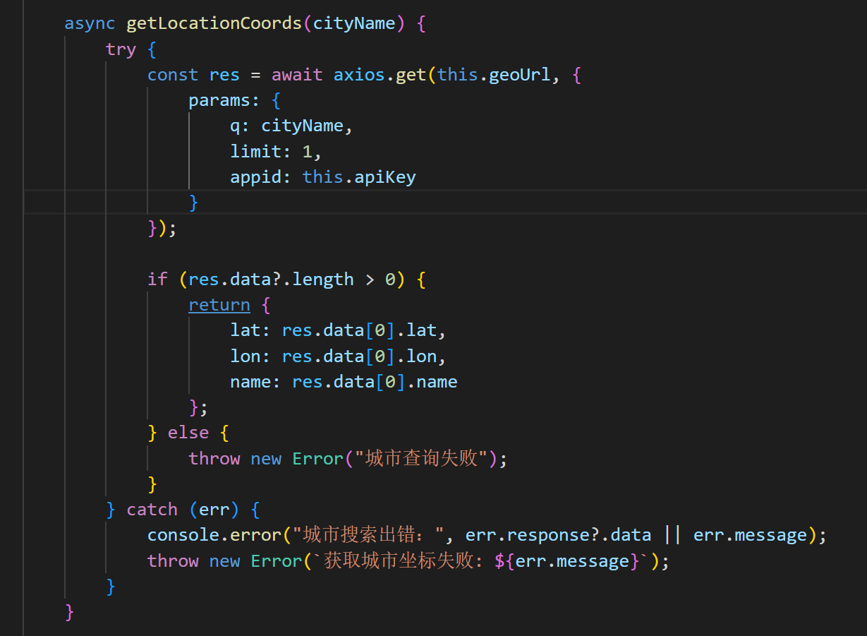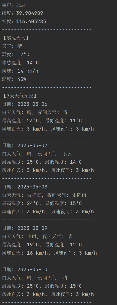 先通过城市的名称返回其对应的经纬度并通过经纬度来进行查询获取其天气信息。再将整体的代码封装成function以便于agent通过用户的输入在对应的城市获取天气信息。