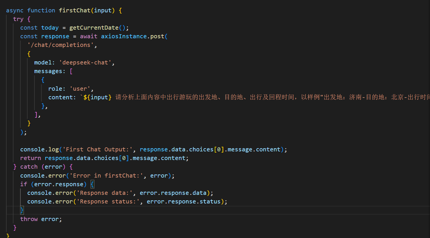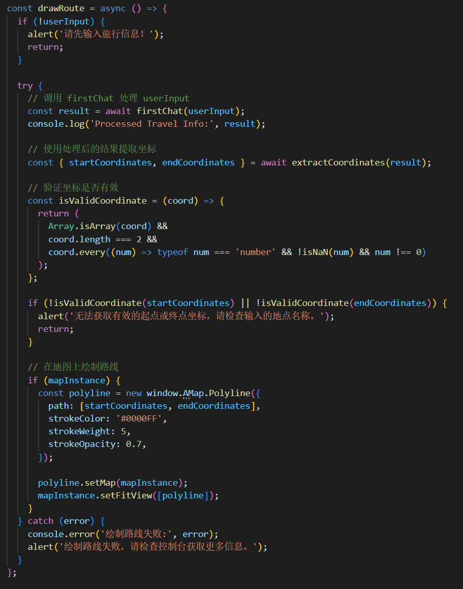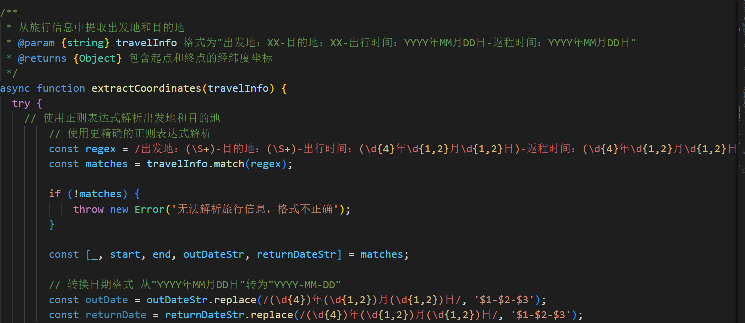 因为用户的输入是自然语言,所以从中获取起点和终点需要首先对其进行处理,先通过deepseek将用户的自然语言处理成为格式化的语言,之后再通过正则表达式提取,从中提取出起点、终点等信息。