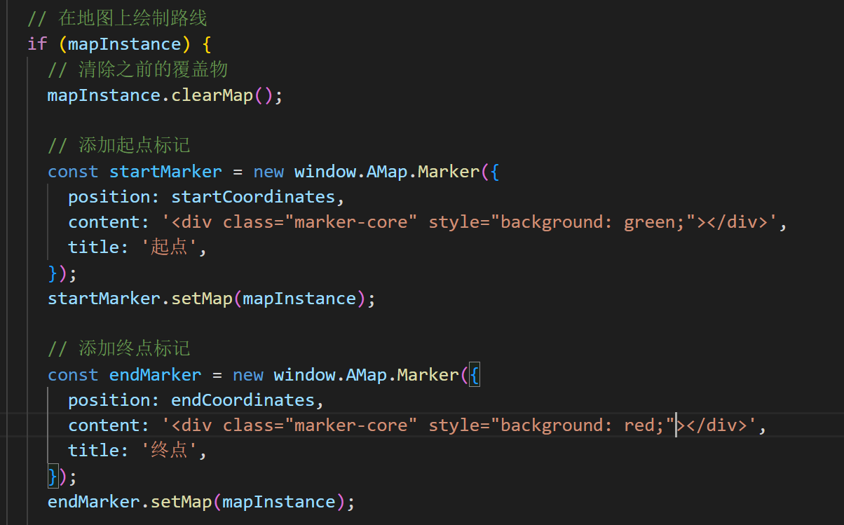 根据用户的输入,创建一个 Marker 实例,并设置标记悬停为起点以及终点,以标记用户的起始点和目的地。