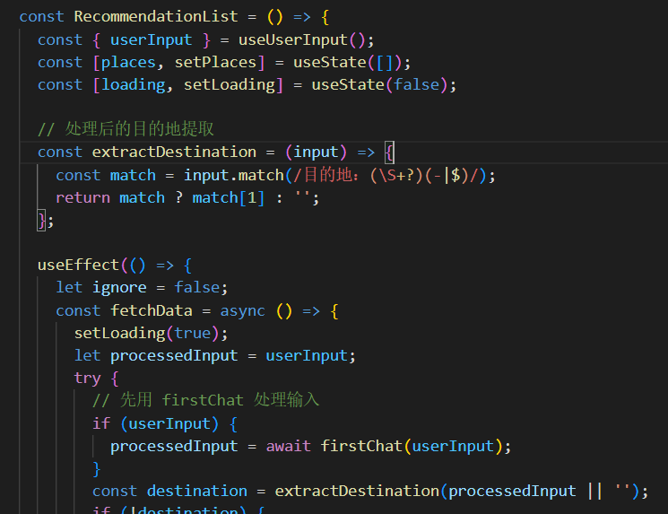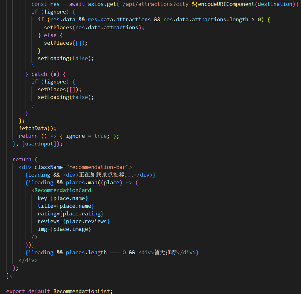 再通过调用后端接口实现景点加载,控制加载状态显示,如果无数据则会显示暂无推荐。