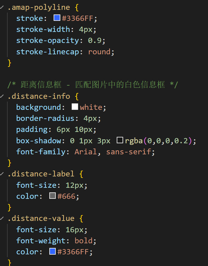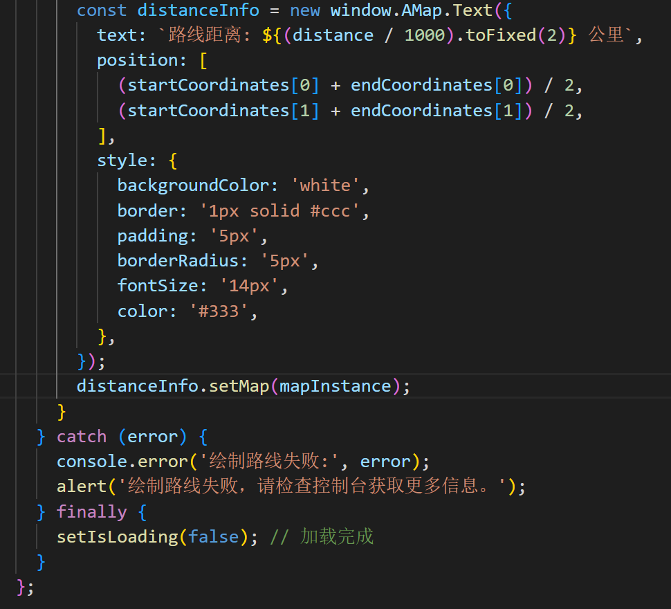 创建一个文本标记,通过起点和终点的经纬度平均值来计算并显示格式化后的路线距离,并将其定位在起点和终点的中间位置。