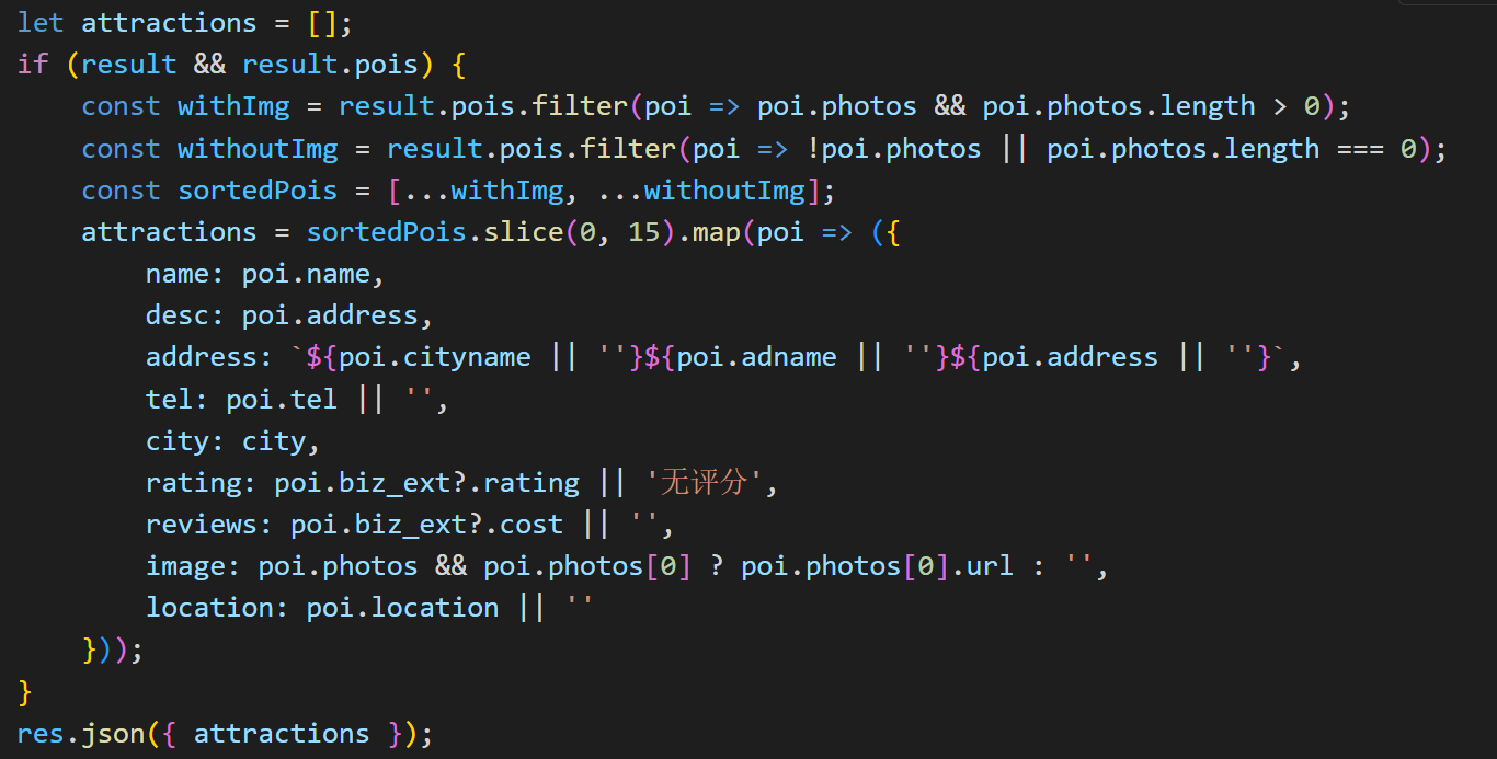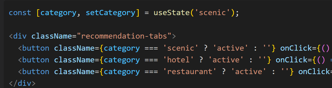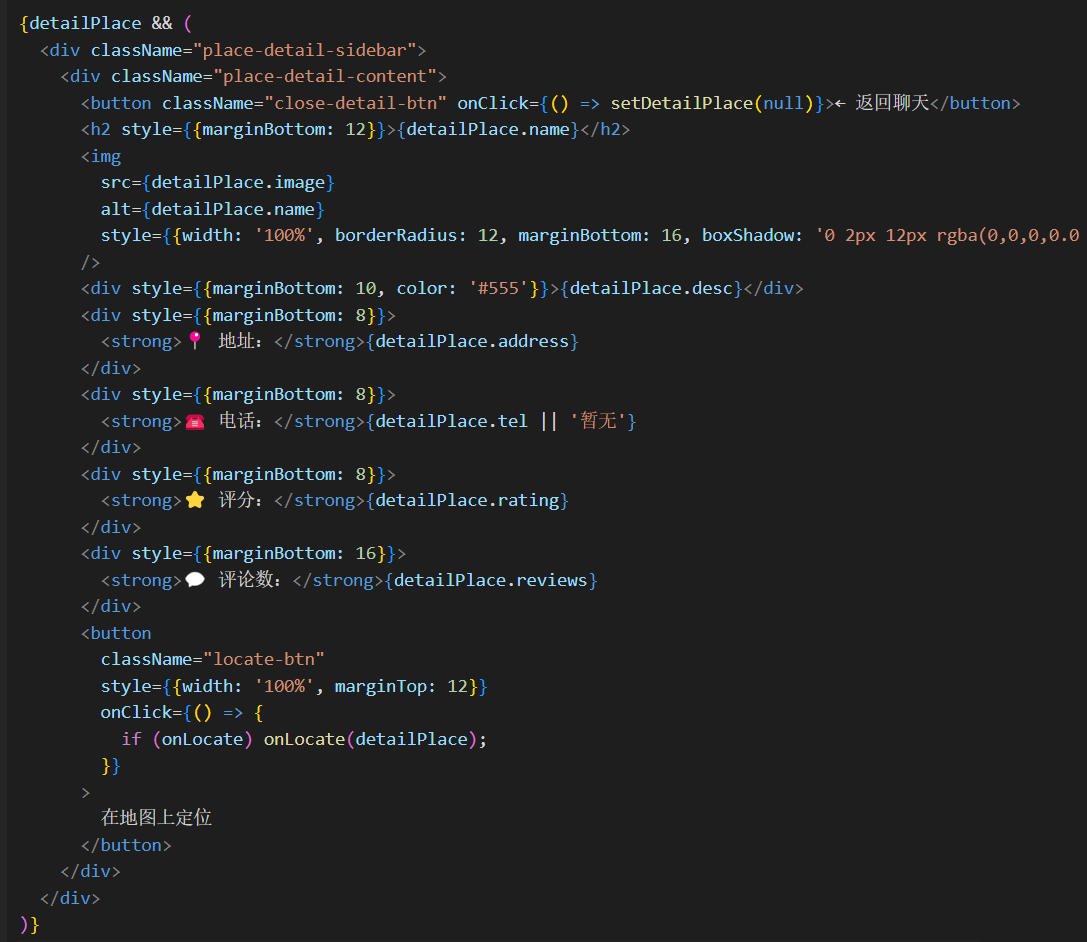 在本次阶段中,实现了多类别推荐(景点/住宿/美食)、推荐栏横向滑轮滚动、美观的详情侧栏等功能。本文将详细介绍这些功能的设计目的、核心代码、遇到的问题与解决方案。