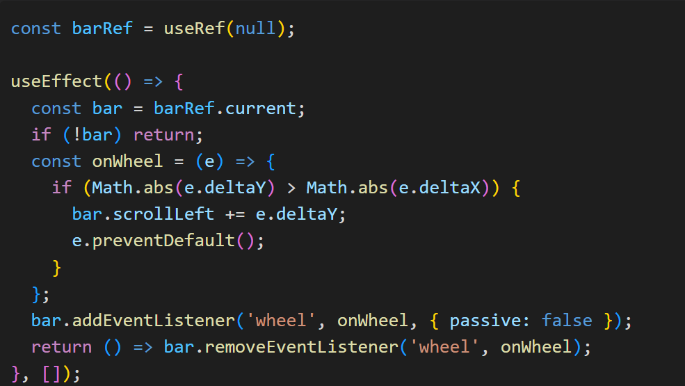- 没有正确绑定 wheel 事件,或 ref 没有指向推荐栏DOM。用 useRef 绑定推荐栏DOM,并在 useEffect 里添加 wheel 事件监听。