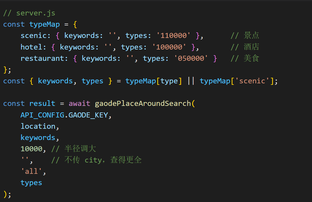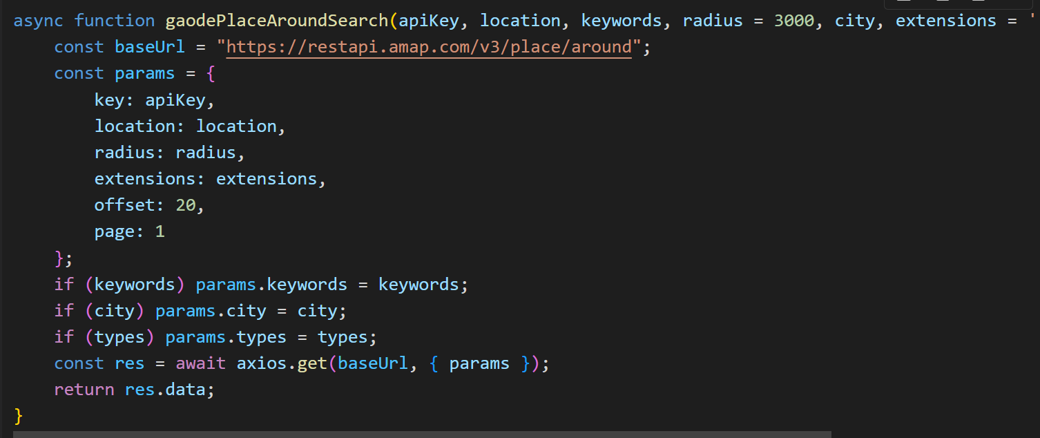 封装高德API请求,支持动态传入 types、keywords、radius 等参数,从而在搜索时可以调整获取的类别,并且便于后续的扩展和调试。