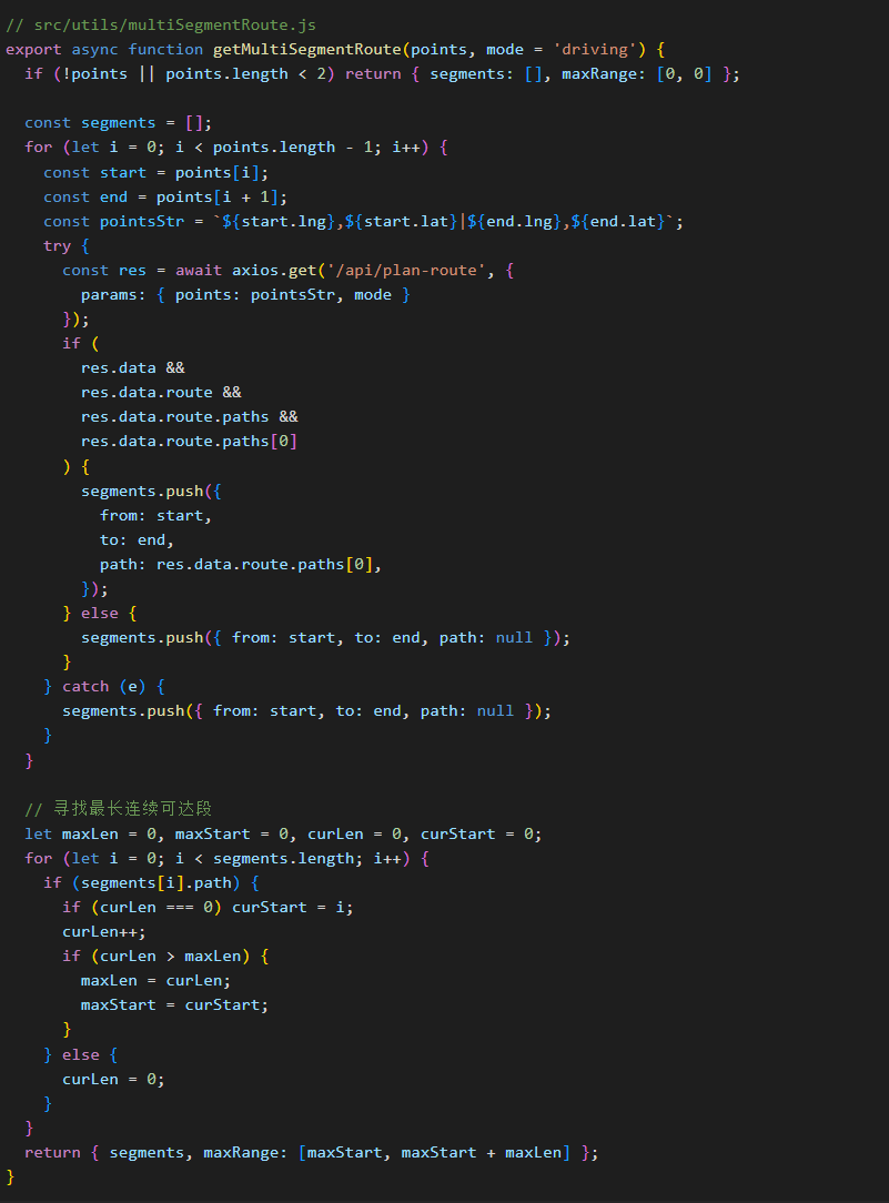 采用分段请求+最长连续可达段,确保即使部分点不可达,也能展示最多的连通路径。