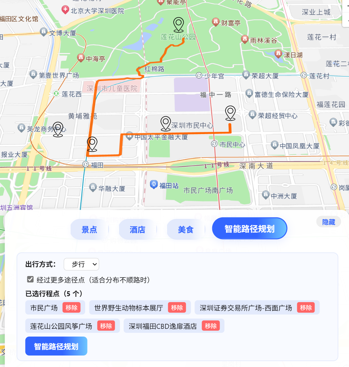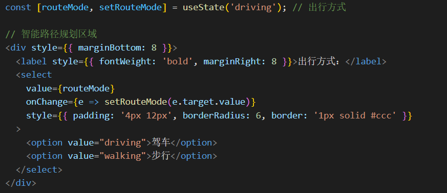 让用户可以在“智能路径规划”区域选择“驾车”或“步行”模式,前端将选择结果作为参数传递给后端。