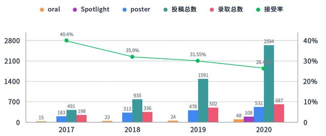 此次会议共接收2594篇论文,录取了687篇,接收率为26.48%。根据下图可知:投稿总数在不断增加,2020年更是呈大幅度上涨;录取数也呈上升趋势,但幅度并不大。所以接收率较往年呈下降趋势。