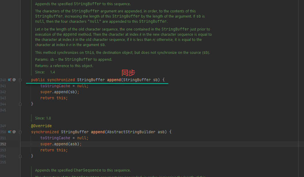 StringBuffer 每次获取 toString 都会直接使用缓存区的 toStringCache 值来构造一个字符串。StringBuffer 的这个toString 方法仍然是同步的。