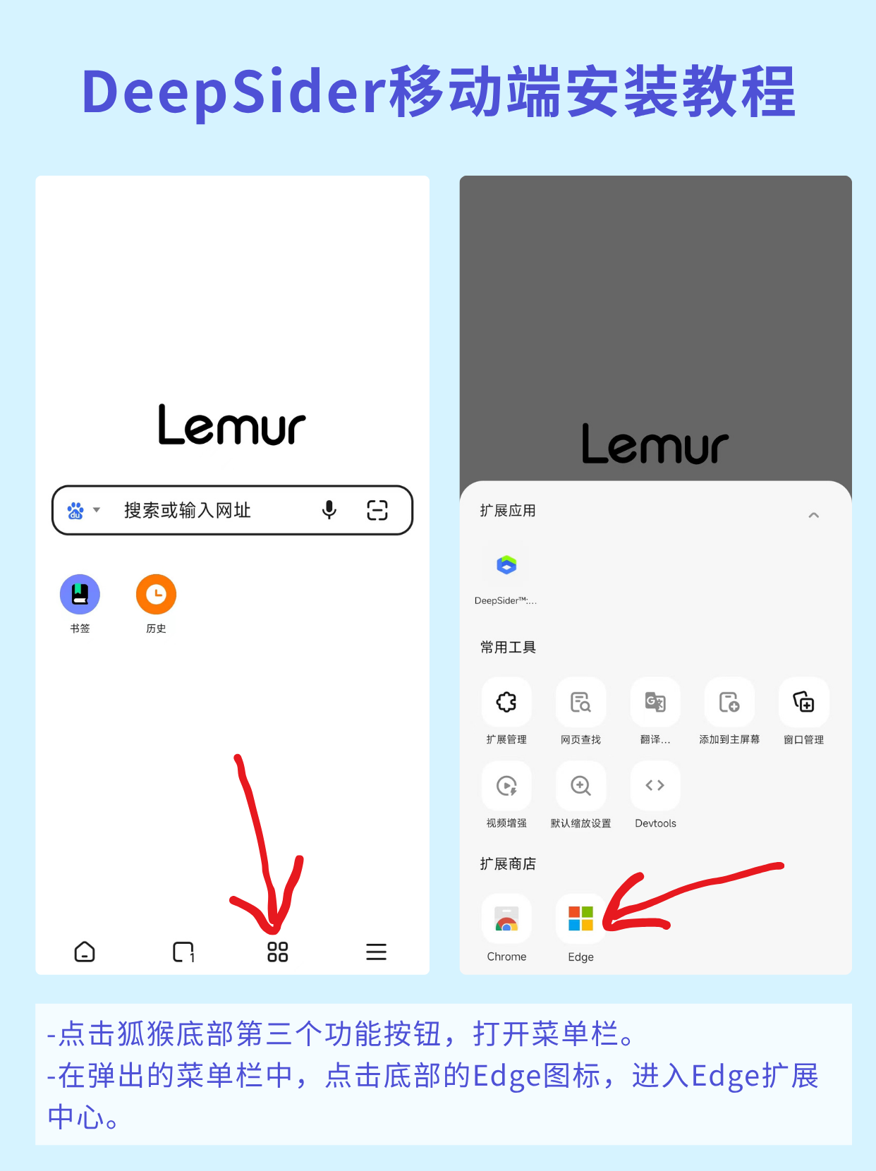 将狐猴浏览器APP安装在手机上(狐猴是一款支持直接安装Chrome和Edge商店扩展的手机浏览器)。