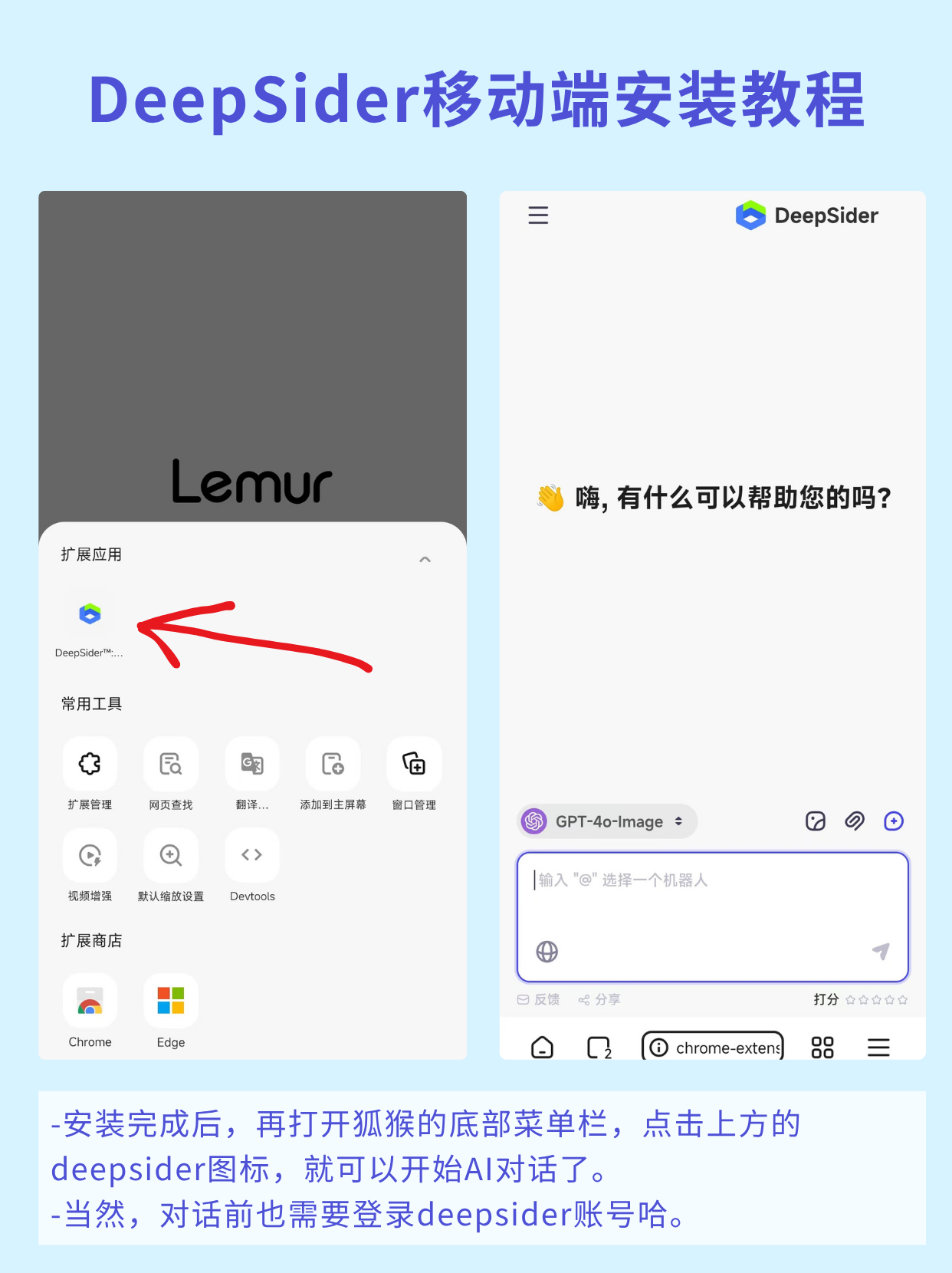 安装完毕后,点击狐猴浏览器底部第三个功能按钮,再点击底部栏上方的DeepSider图标,就可以打开AI对话框了。
