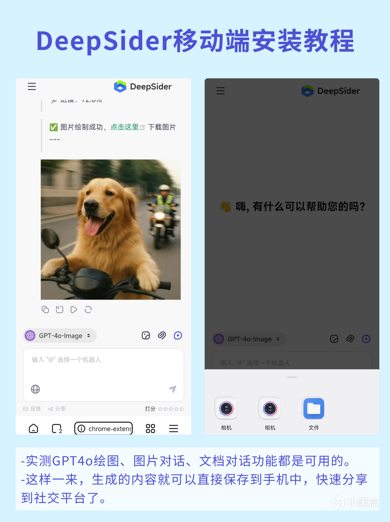 同样支持切换模型,以及图片对话、文件对话功能。生成的图片也可以直接保存到手机中,快速分享到社交平台了。