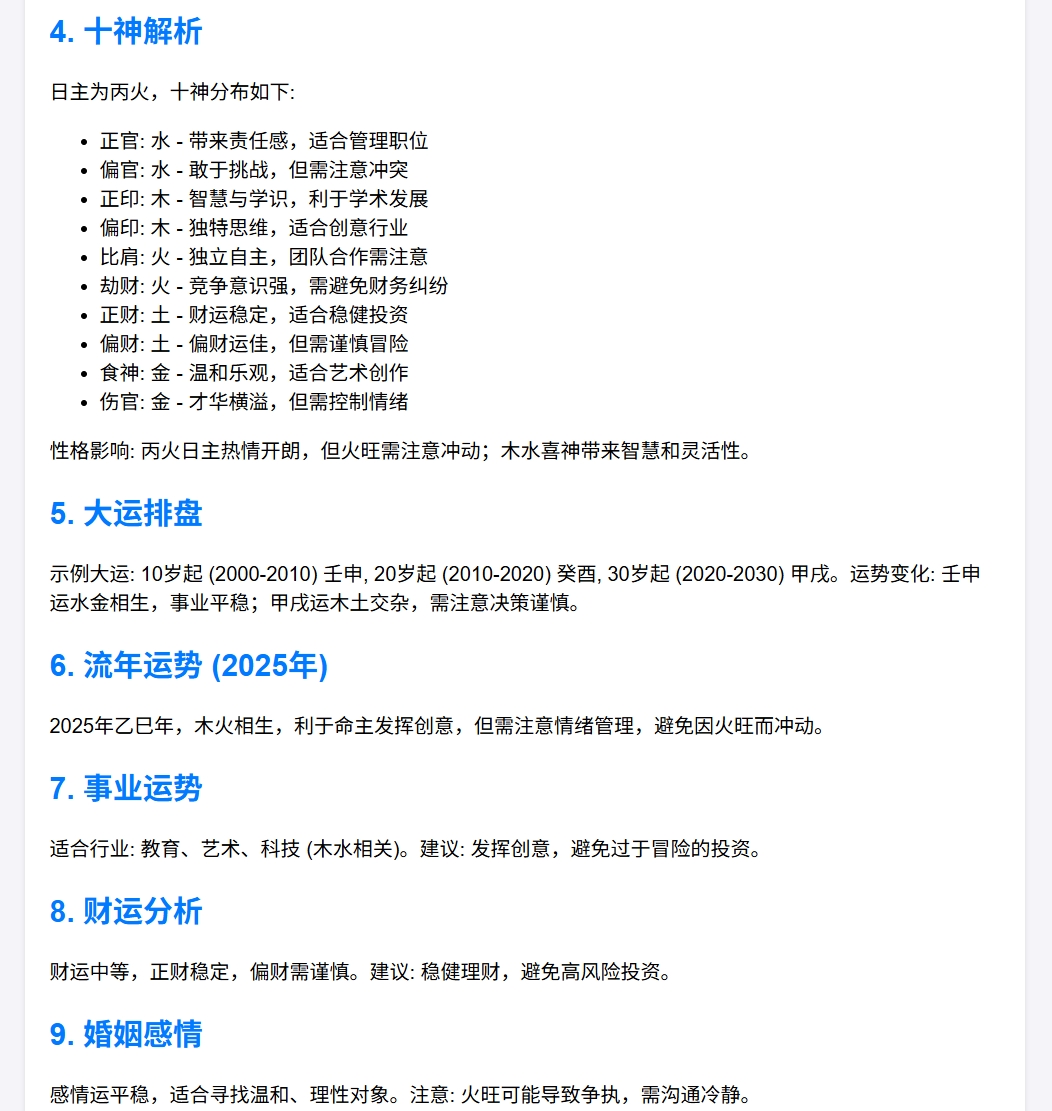 1. 八字排盘:请生成完整的八字排盘,并列出天干地支组合。 2. 五行分析:分析八字中的金、木、水、火、土分布情况,指出哪种五行过旺或过弱。 3. 喜用神确定:根据五行分析确定命局的喜用神和忌神。 4. 十神解析:解释八字中的十神(正官、偏官、正印、偏印、比肩、劫财、正财、偏财、食神、伤官)及其对命主性格与运势的影响。 5. 大运排盘:排出大运流年,并说明各阶段的运势变化。 6. 流年运势:结合当前流年分析对命主当年的具体影响。 7. 事业运势:评估命主的职业发展方向及适合的行业。 8. 财运分析:解析命主的财运状态,指出理财与投资建议。 9. 婚姻感情:分析命主的婚姻和感情运势,包括婚配和感情问题。 10. 健康状况:评估命主的健康状况,并给出养生建议。 11. 子女运势:分析命主的子女缘分及未来子女运势。 12. 学业分析:针对在校或求学中的命主,分析学业及学习领域的发展潜力。 13. 人际关系:探讨命主的人际交往及社交圈情况。 14. 性格特征:根据八字特点描述命主的性格优缺点。 15. 祖业影响:分析家族背景和祖业对命运的影响。 16. 迁移运势:评估是否适合迁居、出国或其他环境变动。 17. 灾难预警:指出可能面临的风险或灾难,并提供预防措施。 18. 贵人运势:分析命主在生活和事业中获得贵人相助的机会。 19. 职业建议:结合八字特点给出适合的职业方向和选择建议。 20. 综合建议:对命主的整体命运进行总结,并提出未来规划和改善建议。