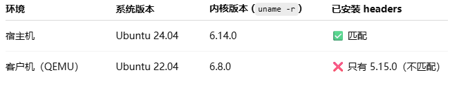 查看我的宿主机Ubuntu为24.04,内核版本为6.14.0,客户机安装的Ubuntu为22.04,默认内核版本为5.15.0。虽然升级到6.8.0运行内核为6.8.0,但apt仓库内核还为5.15.0。导致内核头文件里找不到对应的__struct_group结构体,编译报错。