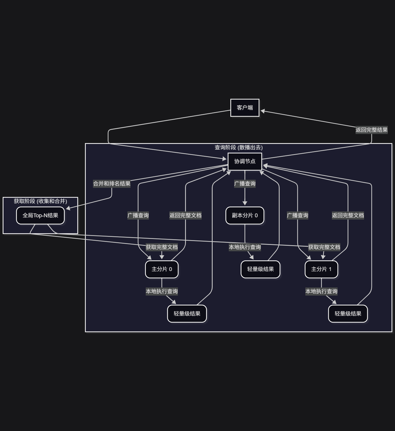 散播阶段: 你的请求会先发给集群里的任意一个节点(这个节点就是“协调节点”),协调节点会把查询“广播”给所有相关的分片,让它们并行执行。