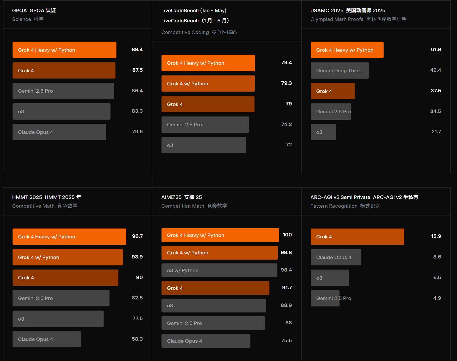 推理能力:Grok4在数学和科学推理上领先GPT-5、Gemini 2.5 Pro和Claude 4 Opus。