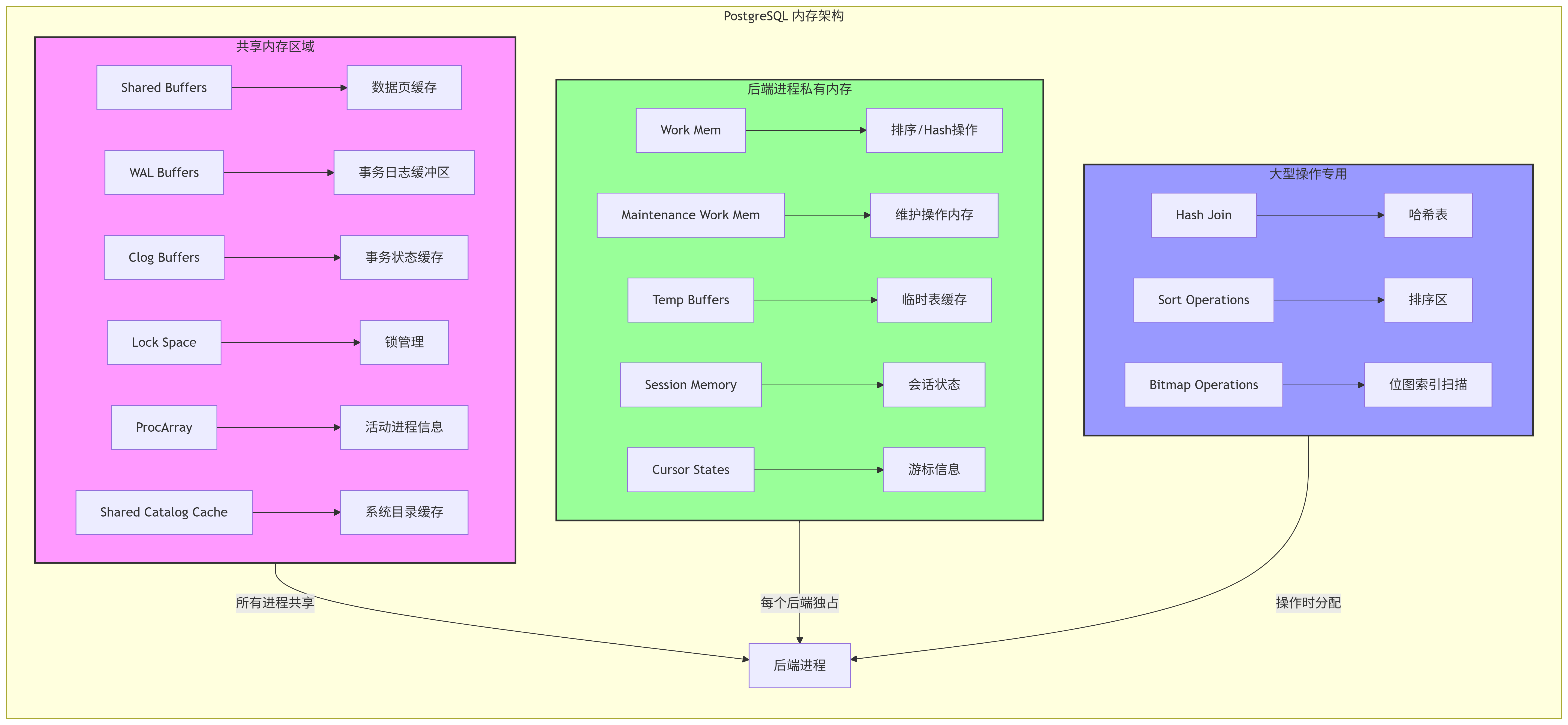 Shared Buffers (共享缓冲区):这是 PG 大脑里最大的一块内存区域,是所有进程共享的“数据缓存区”。从磁盘读取的数据页(Data Page)都会先放在这里,后续的读写操作都直接在这里进行,大大减少了磁盘 I/O。这是 PG 性能调优的核心参数。