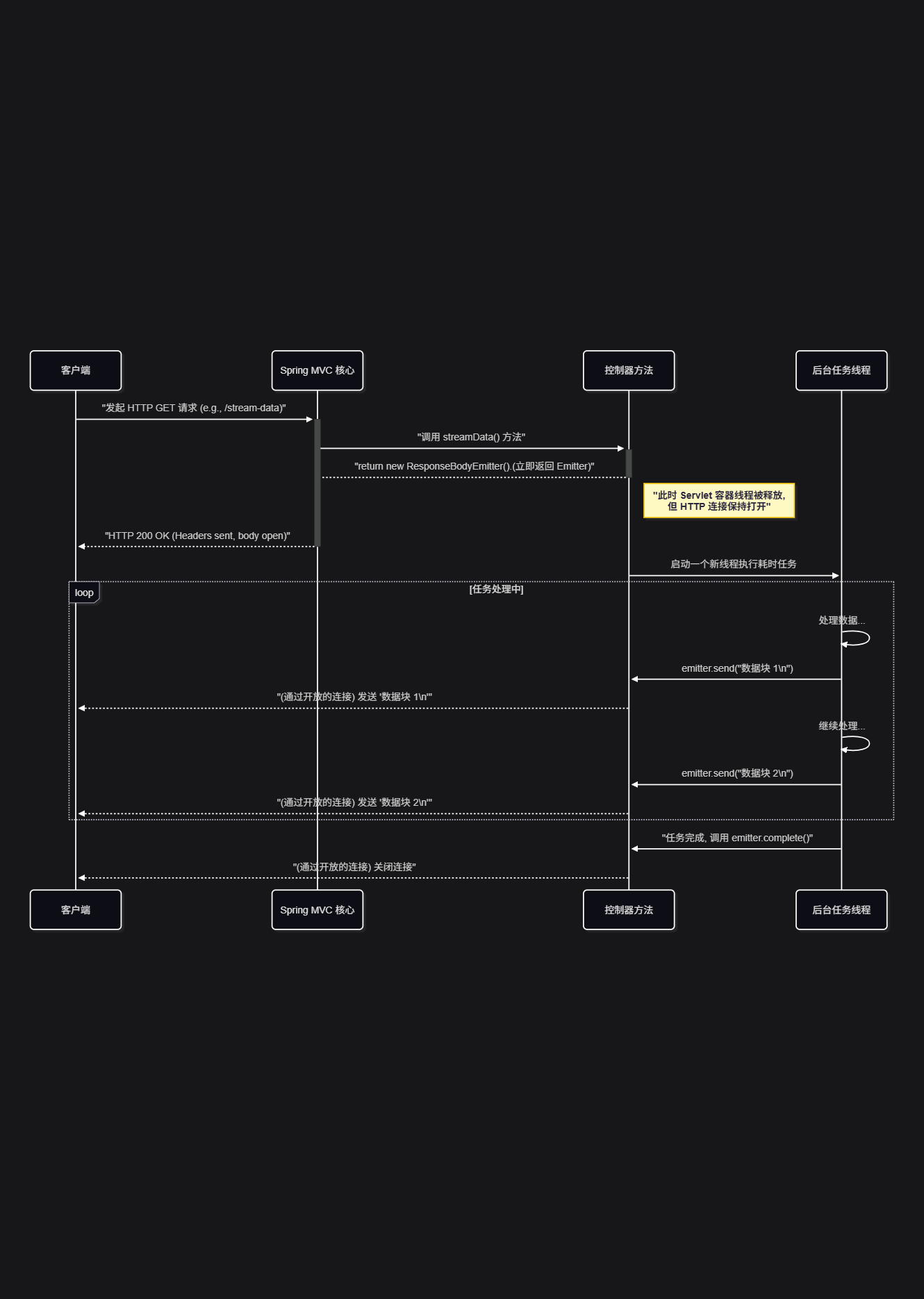 当一个控制器方法返回 ResponseBodyEmitter 时,Spring MVC 会启动异步处理。它会从应用服务器(如 Tomcat)的线程池中释放当前的工作线程,但保持 HTTP 连接不关闭。然后,Spring 会将 ResponseBodyEmitter 对象保存在内存中,并允许你在另一个线程中调用它的 send() 方法来发送数据。