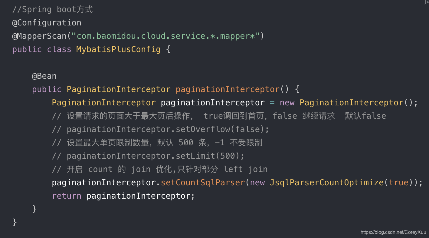 2.查询官网:https://baomidou.com/guide/page.html 可知springboot 需要添加 MybatisPlusConfig 类在加载配置和配置文件