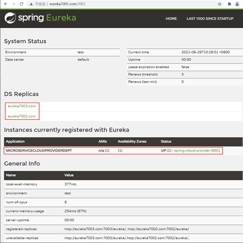 - Status: UP (1) - spring-cloud-provider-8001,UP 表示服务在线, (1) 表示有集群中服务的数量,spring-cloud-provider-8001 则是 micro-service-cloud-provider-dept-8001 配置文件 application.yml 中 eureka.instance.instance-id 的取值。