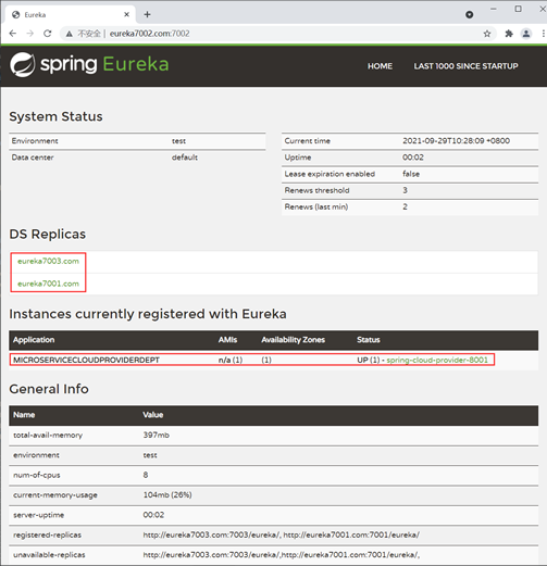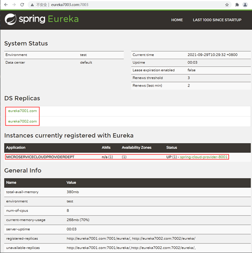 从上图可以看到, 服务提供者(micro-service-cloud-provider-dept-8001)所提供的服务已经注册到了 Eureka Server 7003,并且在 DS Replicas 选项中也显示了集群中的另外两个 Eureka Server:Eureka Server 7001 和 Eureka Server 7002。