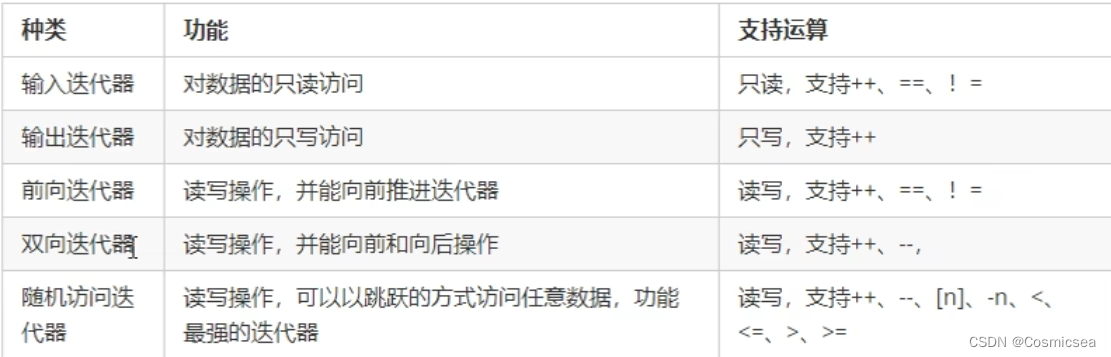 - 迭代器种类如下,其中常见的是双向迭代器和随机访问迭代器
