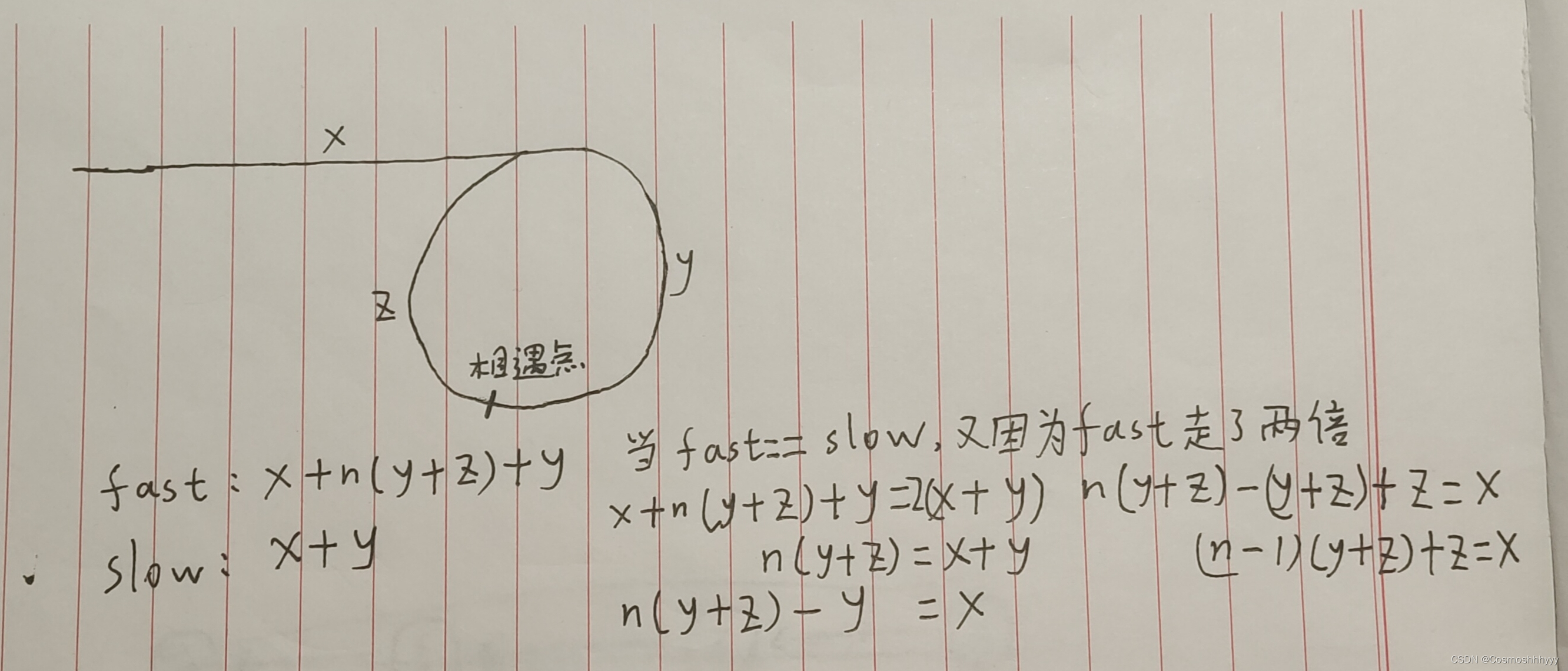 其中n为fast指针在圈里转的圈数,根据算的结果可以看出,当n=1时,z=x,也就是说fast与slow相遇点到环的入口的长度等于x的长度,所以我们只要在头结点和相遇点定义index1,index2两个指针,一起移动,当其相遇的时候,就移动到了环的入口结点,直接返回即可。当然n不一定等于1,根据最后公式,只不过index2会在环里转几圈,最后还是会与index1在环入口相遇。
