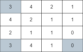 输入:grid = [[3,4,2,1],[4,2,1,1],[2,1,1,0],[3,4,1,0]] 输出:3 解释:上图展示了到达右下角格子经过的 3 个格子。