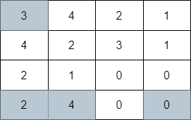 输入:grid = [[3,4,2,1],[4,2,3,1],[2,1,0,0],[2,4,0,0]] 输出:4 解释:上图展示了到达右下角格子经过的 4 个格子。