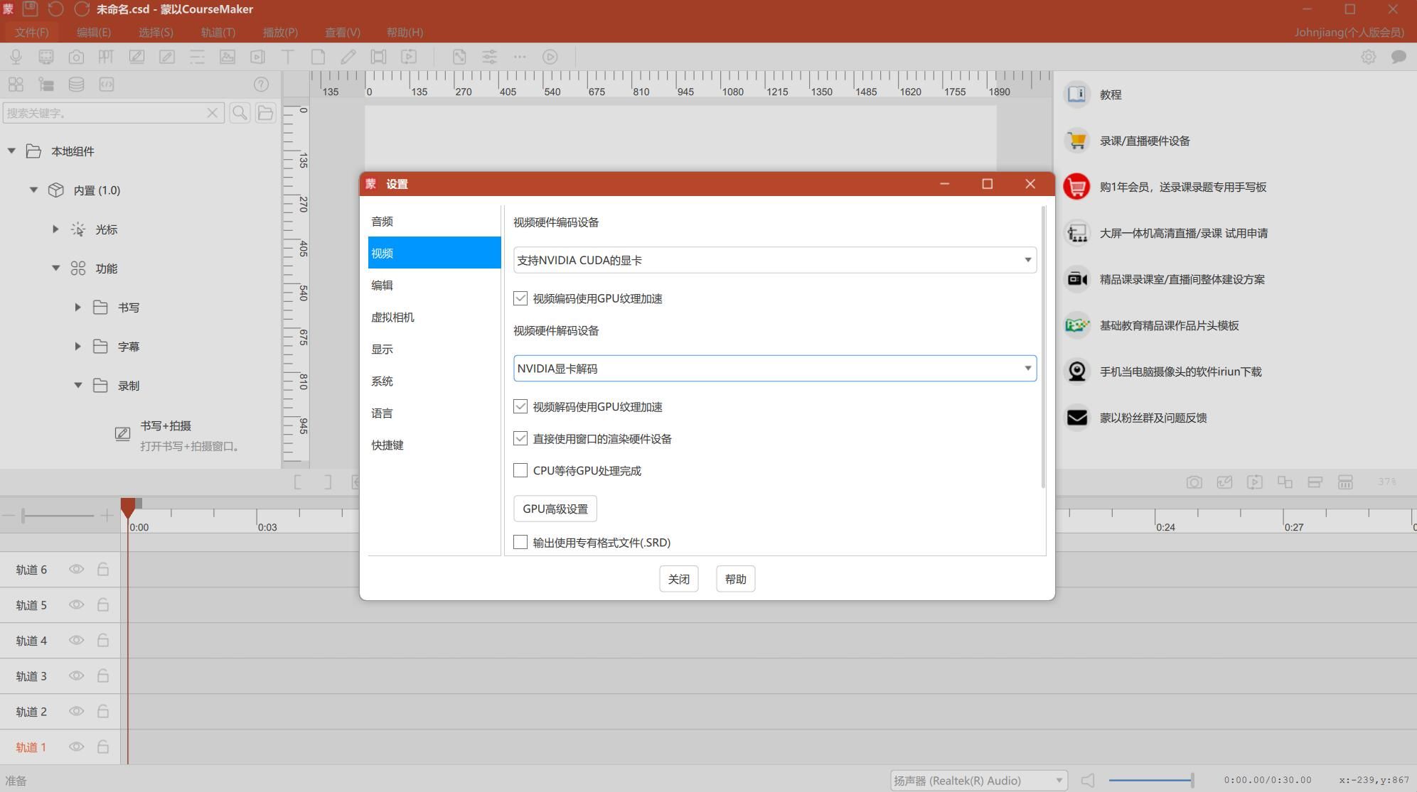 3、在蒙以CourseMaker中启用“硬件加速”(文件——设置——编码和解码设备选择独立显卡设备;
