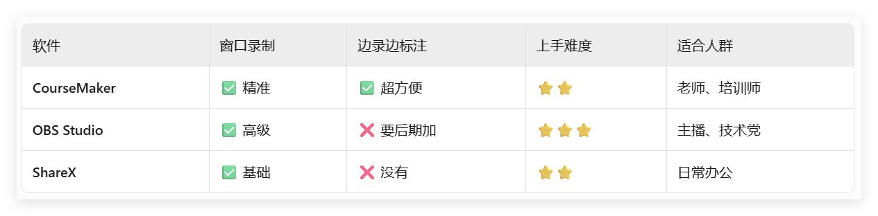 - 做网课/教程 → 首选 CourseMaker,操作简单还能实时标注。