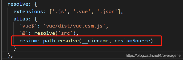 增加一行 const cesiumSource='../node_modules/cesium/Source',之后再resolve中增加一行cesium的路径