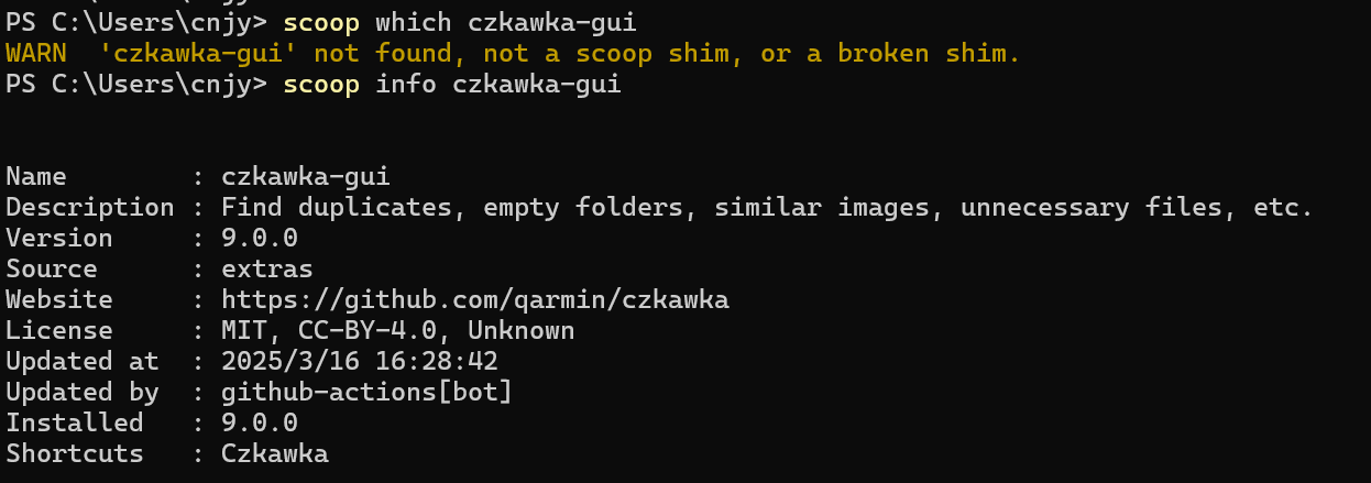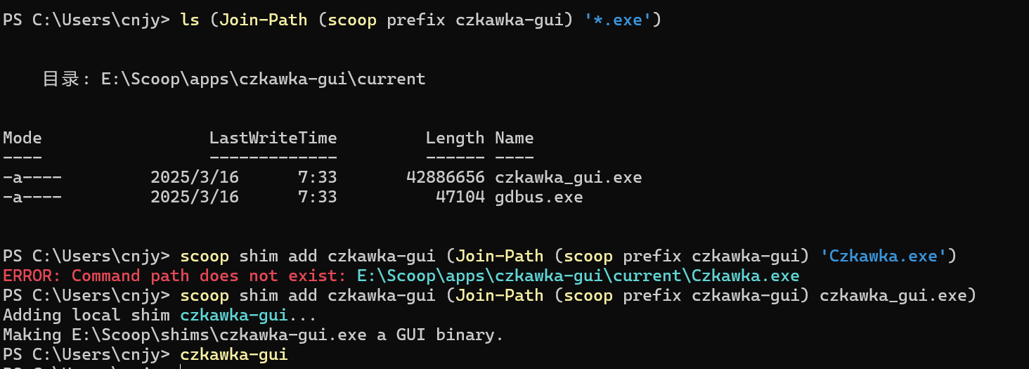 czkawka-gui 这个包 只给“开始菜单”创建了一个快捷方式(Shortcuts → Czkawka),并没有把真正的可执行文件注册成 scoop shim,所以在终端里打 czkawka-gui 当然找不到。