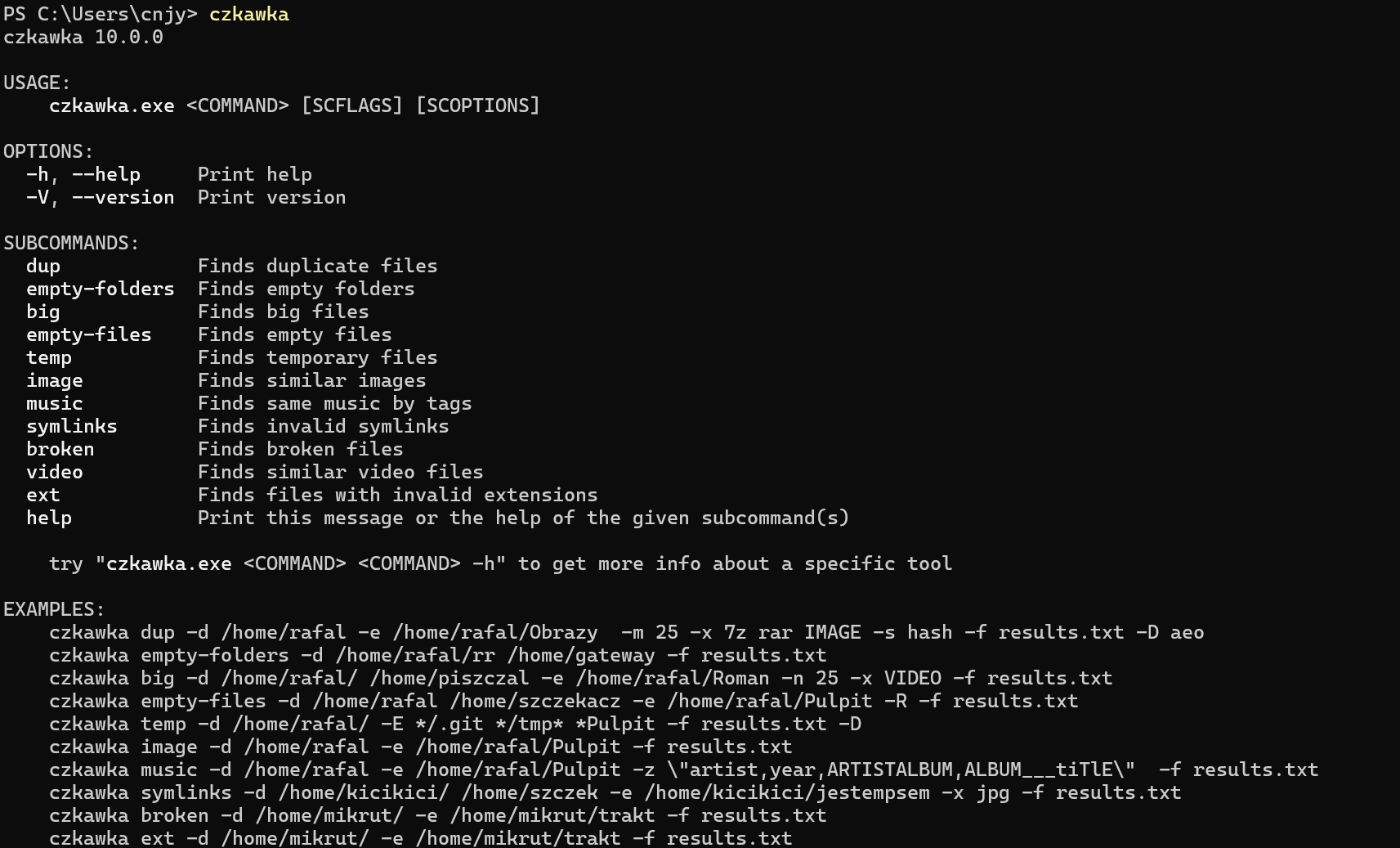 try "czkawka.exe <COMMAND> <COMMAND> -h" to get more info about a specific tool