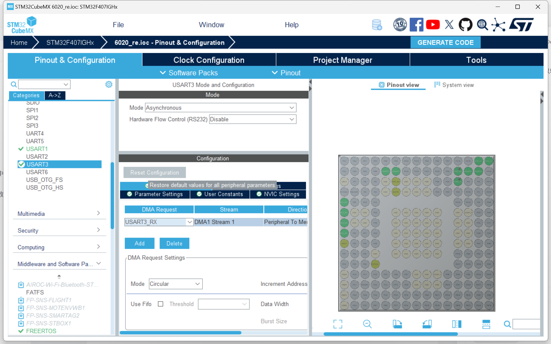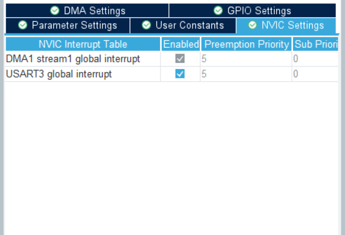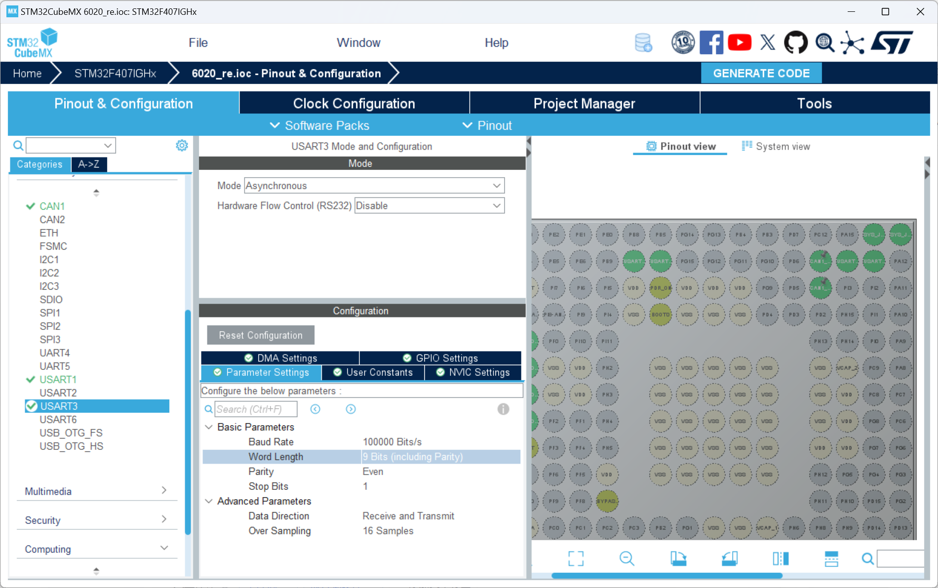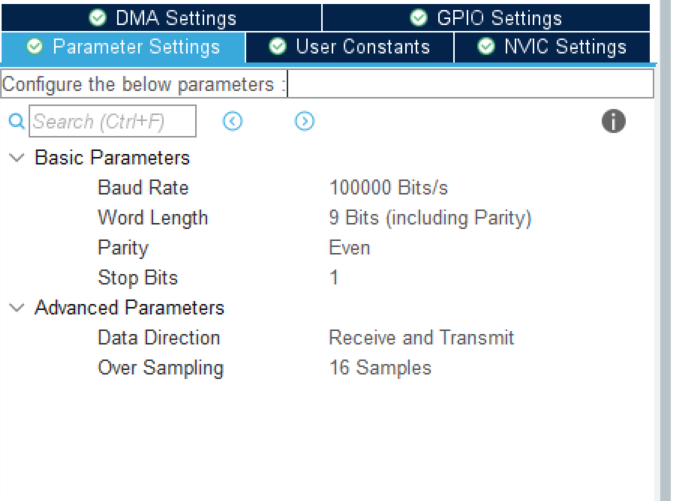 然后打开USART1和USART3二者都为异步收发模式,后者波特率改为100000bit/s word length改为9bits parity改为Even stop bits改为1