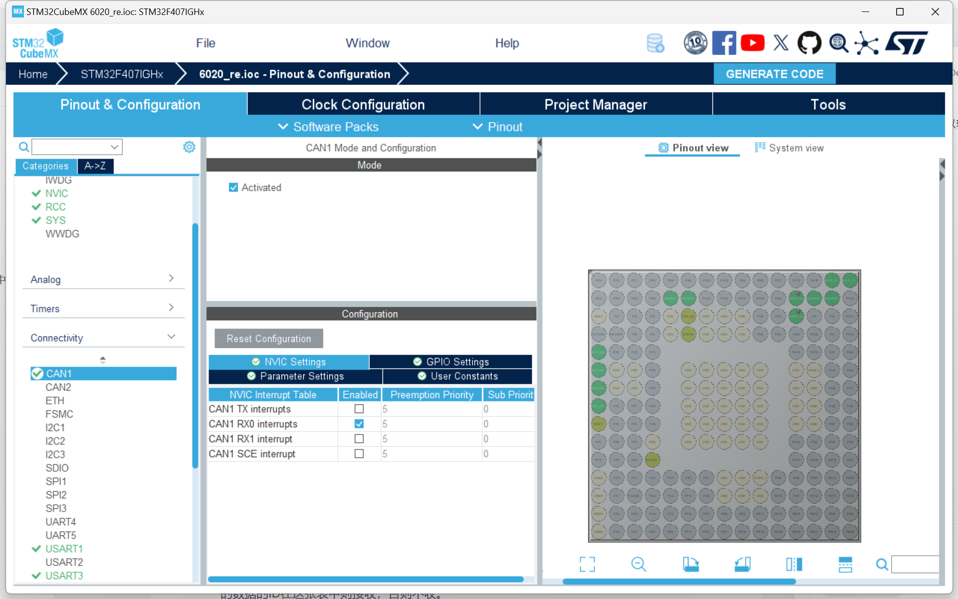 由于我们是要写一个中断回调函数,用于接收单片机收到的数据,所以我们得在CAN1将RX0 interrupts勾选上