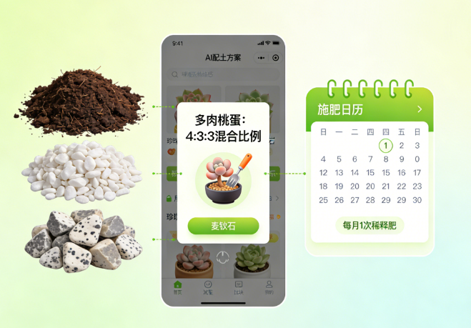 不知道绿萝、多肉、月季该用啥土?担心施肥过多烧根、施肥太少缺营养?AI来救场!输入你养的植物品种(如“多肉桃蛋/绿萝/月季/龟背竹”)、摆放环境(阳台直射/室内散光)、养护经验(新手/有基础),AI1分钟生成专属配土和施肥方案,比如“多肉桃蛋(新手+阳台直射):配土用泥炭土+珍珠岩+麦饭石=4:3:3,每月施1次稀释的多肉专用肥,避免夏季高温施肥”;针对不同植物的习性,标注核心要点,比如“绿萝喜湿但怕积水,配土需加河沙增强透气性;月季喜肥,花期前需增施磷钾肥”;还会推荐高性价比的土料、肥料链接,比如“新手入门推荐通用营养土+缓释肥,省心不踩雷”;上传你现有的土料、肥料照片,AI帮你判断是否适配目标植物,比如“你手里的园土太黏重,养多肉需添加珍珠岩改良透气性”,从此告别“凭感觉配土施肥”的尴尬!