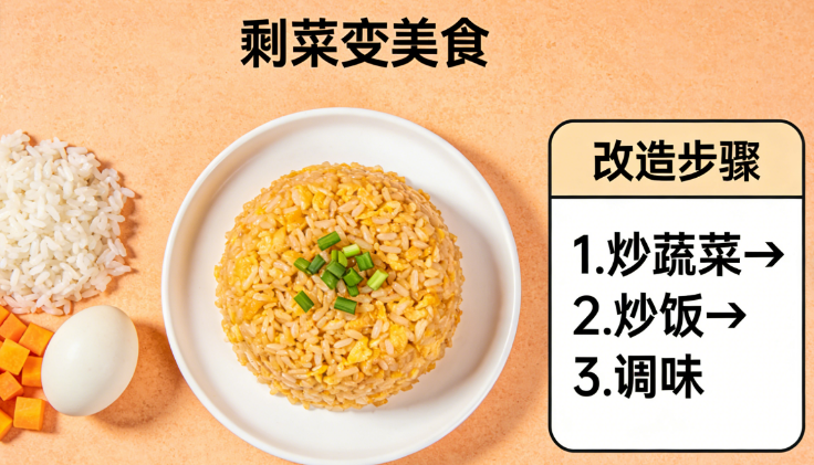 剩米饭、剩排骨、剩蔬菜放冰箱没人吃?反复加热口感变差?AI来救场!输入家里的剩菜清单(如“剩米饭+半根胡萝卜+1个鸡蛋+少量青椒”“剩排骨+1根玉米+半根山药”),AI1分钟生成3-5种改造方案,标注“操作步骤、调味建议、口感特点”,比如“剩米饭改造:蛋炒饭升级版——1. 胡萝卜、青椒切丁,鸡蛋炒散备用;2. 热油炒香蔬菜丁,加入剩米饭压散翻炒;3. 倒入鸡蛋,加少许盐、生抽、葱花调味,翻炒均匀即可,口感鲜香入味”;“剩排骨改造:玉米山药排骨汤——1. 剩排骨加热去油脂,玉米切段、山药去皮切块;2. 排骨和玉米、山药一同放入砂锅,加足量清水;3. 大火烧开后转小火慢炖20分钟,加少许盐调味,口感清甜解腻”;针对不同剩菜类型,标注改造核心技巧,比如“剩肉类避免反复油炸,优先选择炖煮、清蒸改造;剩蔬菜优先快炒,避免流失水分”,从此剩菜再也不是“负担”,反而能变身餐桌新惊喜!