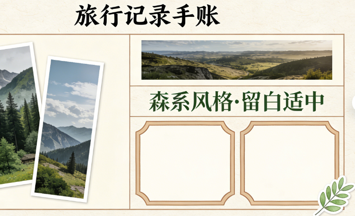 每次做手账都卡在排版环节,要么留白太多,要么内容挤成一团?想尝试不同风格排版却没头绪?AI来救场!输入手账主题(如“旅行记录/美食探店/日常心情/节日纪念”)、页面尺寸(A5/B6/活页本)、素材数量(照片3张/贴纸5张/文字较多),AI1分钟生成3套专属排版方案,标注“素材摆放位置、文字区域划分、风格亮点”,比如“旅行记录手账(A5尺寸,3张风景照+少量文字):1. 左侧留1/3区域贴2张竖版风景照,上下错落摆放;2. 右侧上半部分贴1张横版照片,下半部分划分2个文字框,分别记录旅行感悟和行程亮点;3. 角落用2枚小贴纸点缀,整体采用清新森系风格,留白适中不拥挤”;“美食探店手账(B6尺寸,多张美食照+较多文字):1. 采用网格排版,顶部用横幅文字写探店主题;2. 中间划分3个小区域贴美食特写照片,每张照片配1句简短点评;3. 底部用通栏区域记录探店细节,搭配食物类小插画,整体风格活泼明快”;还会标注排版小技巧,比如“文字多的手账优先选择分栏排版,避免密密麻麻;照片多的手账用错落摆放代替整齐排列,更具动感”,从此手账排版再也不用瞎琢磨!