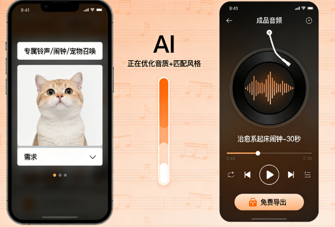 想拥有专属手机铃声、起床闹钟,却找不到合心意的?想给自家宠物做专属召唤音频,却不知道怎么制作?AI来帮忙!输入你的声音需求(如“用我的声线做治愈系起床闹钟/定制专属手机来电铃声/生成宠物召唤语音”)、风格偏好(如“温柔治愈/搞笑魔性/可爱俏皮”)、时长(如“30秒/1分钟”),AI1分钟生成专属声音作品,比如“治愈系起床闹钟:用你改造后的温柔声线,搭配轻缓背景音,播报‘早安呀,该起床啦,今天也是元气满满的一天哦~’,还能加入你的专属昵称”;“专属手机铃声:提取你的原声片段,AI优化音质后,搭配潮流BGM,剪辑成15秒魔性铃声,避免和别人撞款”;“宠物召唤语音:用宠物熟悉的你的声线,加入零食、玩具相关的关键词,比如‘小白,过来吃零食啦~’,AI优化声音频率,让宠物更容易有反应”;支持免费导出音频,直接保存到手机使用,操作简单到飞起!
