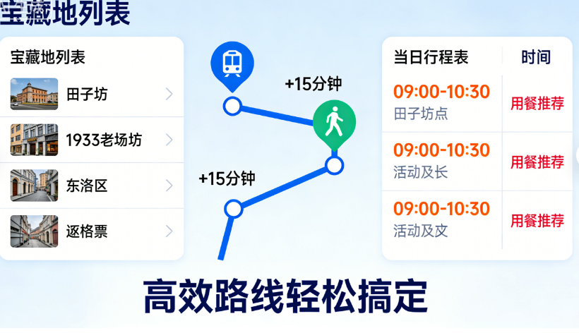 找到小众地却不知道怎么串联行程?担心交通不便或路线绕路?不知道每个地方该停留多久?AI来帮忙!输入筛选好的小众宝藏地、出行方式(如“地铁+步行/自驾/骑行”)、出发地点、预计出行时长、用餐需求(如“想吃当地特色小吃/小众餐厅/高性价比简餐”),AI1分钟生成专属行程规划,包含“路线顺序、交通方式、停留时长、用餐推荐”,比如“上海小众探索行程(周末全天+地铁+步行+想吃特色小吃):1. 上午9:00-11:30 逛田子坊老街(停留2.5小时,感受老上海弄堂风情,吃上海生煎、小笼包);2. 上午11:30-13:00 附近老上海小吃店用餐(推荐XX生煎铺,人均30元);3. 下午13:30-15:30 打卡1933老场坊(停留2小时,复古工业风建筑,适合拍照);4. 下午16:00-18:00 逛多伦路文化名人街(停留2小时,感受文艺氛围,打卡小众书店);5. 交通:田子坊→1933老场坊(地铁9号线转4号线,约30分钟),1933老场坊→多伦路(地铁4号线转8号线,约25分钟)”;支持行程灵活调整,比如“想增加某小众地,AI自动优化路线;想缩短某地方停留时间,AI重新分配时长”;还会标注“最佳游览时段”,比如“某小众咖啡馆上午人最少,适合拍照;某老街晚上灯光好看,氛围感更强”,让你的城市探索高效又舒适!