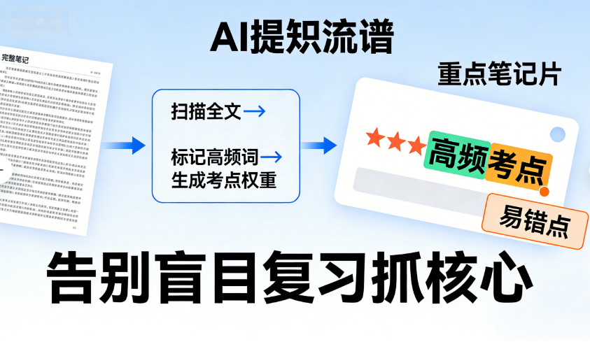 笔记内容太多,复习时不知道该看哪里?抓不住知识点核心,刷题总踩坑?想总结高频考点却没头绪?AI来帮忙!上传整理后的基础笔记、课程大纲、考试范围(如“期末考重点/考研核心考点/雅思高频知识点”),AI1分钟提炼专属重点笔记,包含“核心知识点、高频考点、易错点警示、考点权重”,比如“英语四六级阅读笔记重点提炼:1. 核心知识点:梳理常考的主旨题、细节题、推理题解题技巧,标注每种题型的答题步骤;2. 高频考点:提炼近3年四六级阅读高频词汇、固定搭配,附例句辅助记忆;3. 易错点警示:标注易混淆的同义替换词、常见答题误区,比如‘偷换概念’‘以偏概全’的选项特征;4. 考点权重:用星级标注考点重要程度,比如主旨题标注★★★★★,态度题标注★★★★”;“专业课(市场营销)重点提炼:1. 按‘理论知识-案例分析-考点应用’三层级提炼,比如‘4P理论’补充经典商业案例和答题模板;2. 标注高频考点的出题形式,比如‘市场定位’常考简答题和案例分析题,附答题框架;3. 生成‘考点关联图’文字说明,梳理不同知识点之间的逻辑关系,比如‘市场细分’与‘目标市场选择’的衔接点”,让复习效率翻倍!