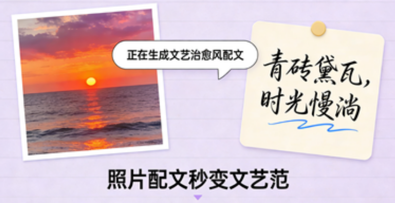 想给照片配文案却没文采?不知道怎么描述旅行中的心情和趣事?担心文案太俗套没特色?AI来帮忙!上传筛选后的旅行照片、旅行细节(如“旅行地点、出行天数、印象最深的事、遇到的有趣的人”)、文案风格(如“文艺治愈风/活泼俏皮风/幽默吐槽风/温情叙事风”),AI1分钟生成专属旅行文案,包含“照片配文、段落叙事、心情感悟”,比如“古城游+文艺治愈风文案:1. 古城墙照片配文:‘青砖黛瓦,时光慢淌,走在古城的石板路上,仿佛穿越了千年岁月’;2. 特色小吃照片配文:‘一碗热气腾腾的古城小吃,藏着当地人的烟火温情,是旅行里最治愈的味道’;3. 段落叙事:‘在古城待了三天,没有赶景点的匆忙,只是慢悠悠地逛小巷、看老建筑、和当地人聊天。这里的时光好像格外温柔,连风都带着淡淡的桂花香气,这大概就是旅行最好的状态’;4. 心情感悟:‘旅行的意义,不是打卡多少景点,而是遇见不一样的风景,感受不一样的生活,然后带着满满的温暖回归日常’”;支持文案个性化调整,比如“想增加幽默吐槽元素、补充具体旅行细节”,让每一段文案都贴合你的旅行体验!