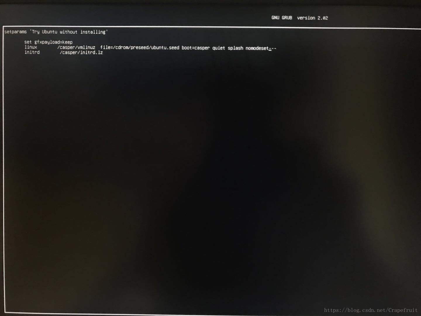 5.2. 保险起见,选择第一项Try Ubuntu。可能会有显卡问题,可先按e,在splash后补上nomodeset.