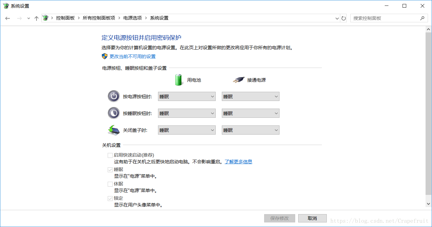 4.1. 关闭Win10系统快速启动。具体过程为:开始–>设置–>系统–>电源和睡眠–>其他电源设置–>选择电源按钮的功能–>将“启用快速启动(推荐)”取消.