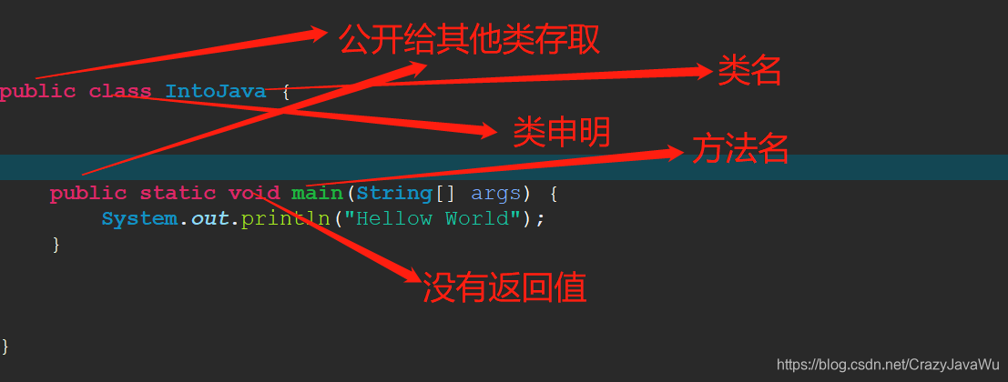 第一段代码我们还是以一个hellow world开始,编写这段代码是为了说明,每个Java程序至少都会有一个类以及一个main()。并且有且只有一个main()函数作为程序的入口。