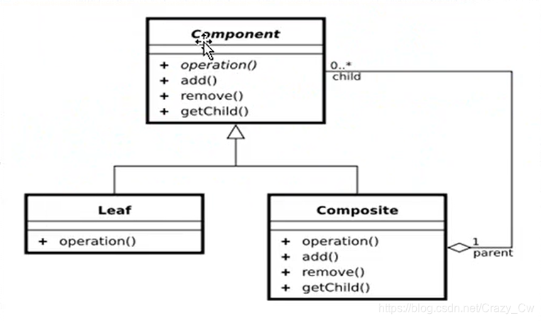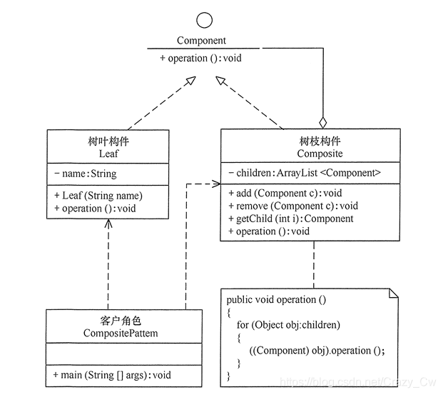 安全方式:在该方式中,将管理子构件的方法移到树枝构件中,抽象构件和树叶构件没有对子对象的管理方法,这样就避免了上一种方式的安全性问题,但由于叶子和分支有不同的接口,客户端在调用时要知道树叶对象和树枝对象的存在,所以失去了透明性。