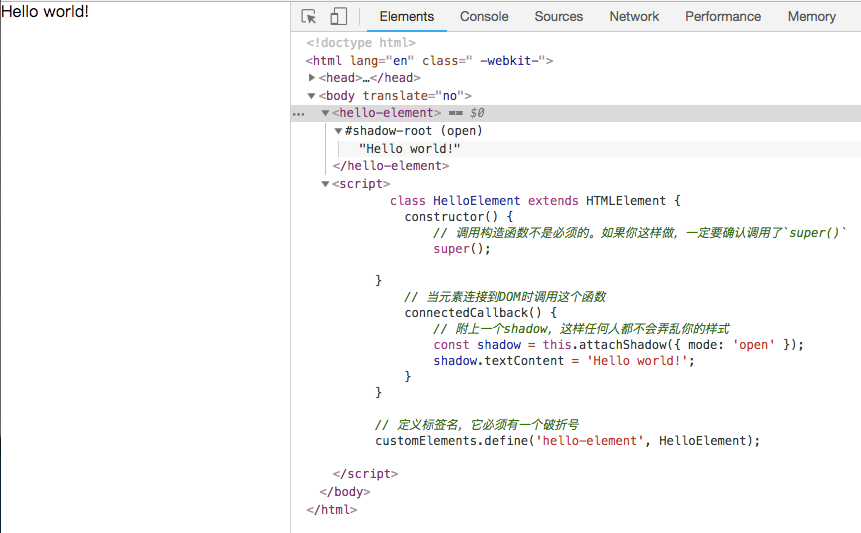 在HTML中你可以像下面这样调用自定义的元素hello-element: