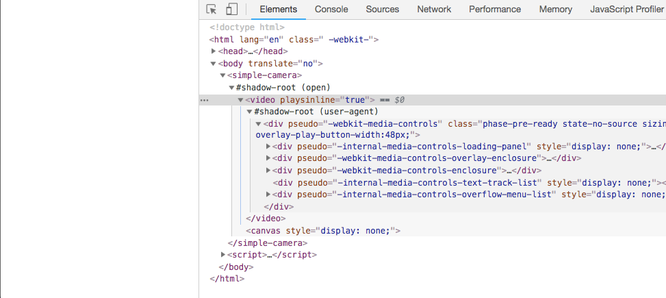 这篇文章并没有指定在哪个框架构建摄像头组件。叶节点(Leaf Node)组件应该是可重用的。自定义元素是一种新的浏览器标准,允许你构建可在大多数JavaScript框架中移植的可重用元素。如果你不熟悉自定义元素(Custom Elements)并不重要。因为接下来的示例都是一些简单的示例,所以使用自定义元素并不复杂。在高级情况下,它会变得复杂,但我们将会避开这些。这是一个简单的例子: